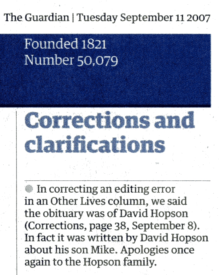 Michael Declan Melia Hopson bka Mike Mike's Obituary - Original: Word or PDF | Guardian 4/9/07 | Guardian online (no Grauniad typos!) When the Guardian published Mike's obituary they made a number of mistakes - missing out his name in the title line, and screwing up some of the words. The Guardian both emailed and phoned to apologise for any distress the errors may have caused us - which we appreciated. However the truth is we were more amused than upset by the thought that Mike's obituary was in the truly authentic Grauniad tradition, although Mike himself might have missed such a subtlety as he never really got to grips with the written word. However the following correction would surely have had him laughing when it was read out to him: