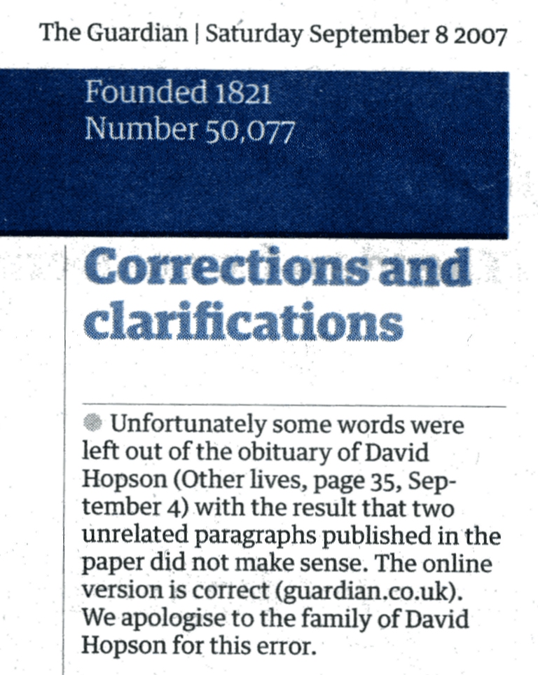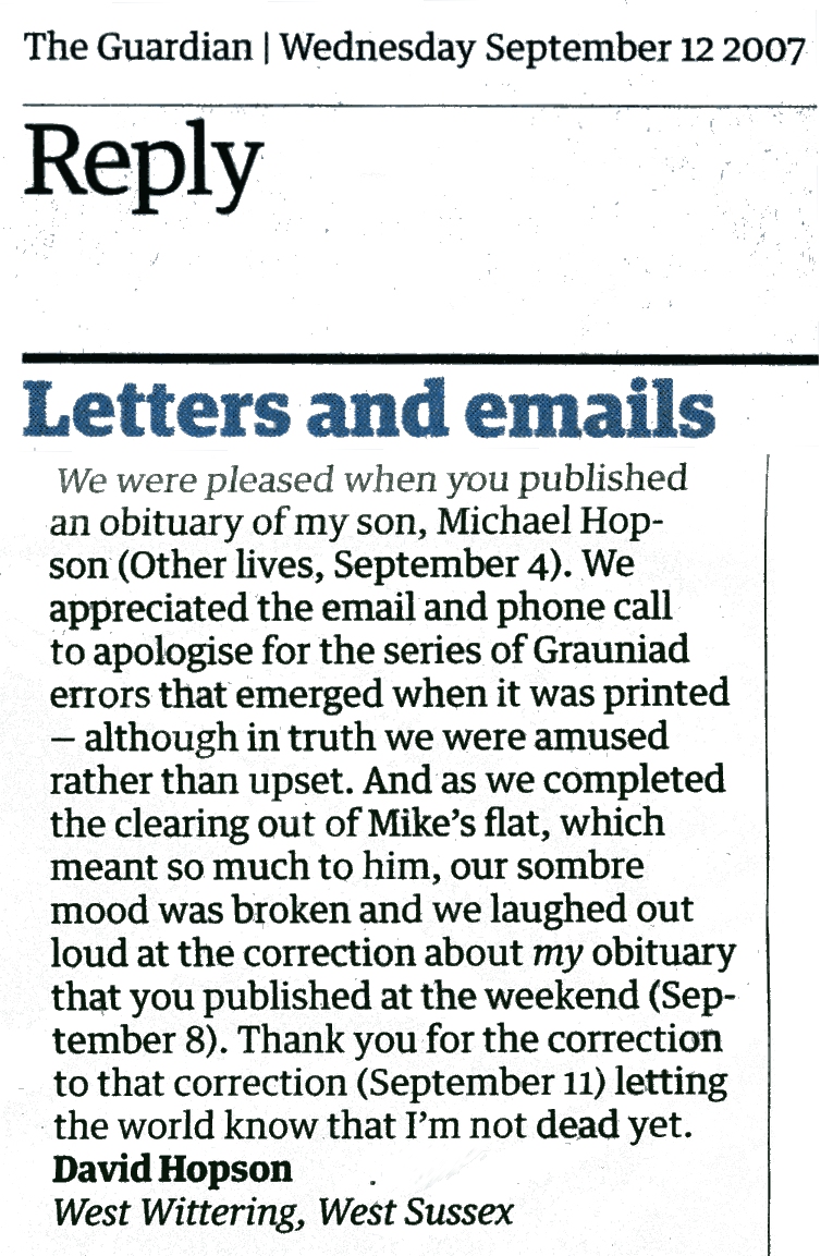 Michael Declan Melia Hopson bka Mike Mike's Obituary - Original: Word or PDF | Guardian 4/9/07 | Guardian online (no Grauniad typos!) When the Guardian published Mike's obituary they made a number of mistakes - missing out his name in the title line, and screwing up some of the words. The Guardian both emailed and phoned to apologise for any distress the errors may have caused us - which we appreciated. However the truth is we were more amused than upset by the thought that Mike's obituary was in the truly authentic Grauniad tradition, although Mike himself might have missed such a subtlety as he never really got to grips with the written word. However the following correction would surely have had him laughing when it was read out to him: